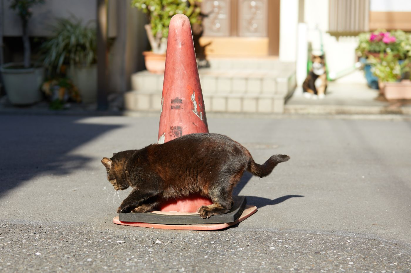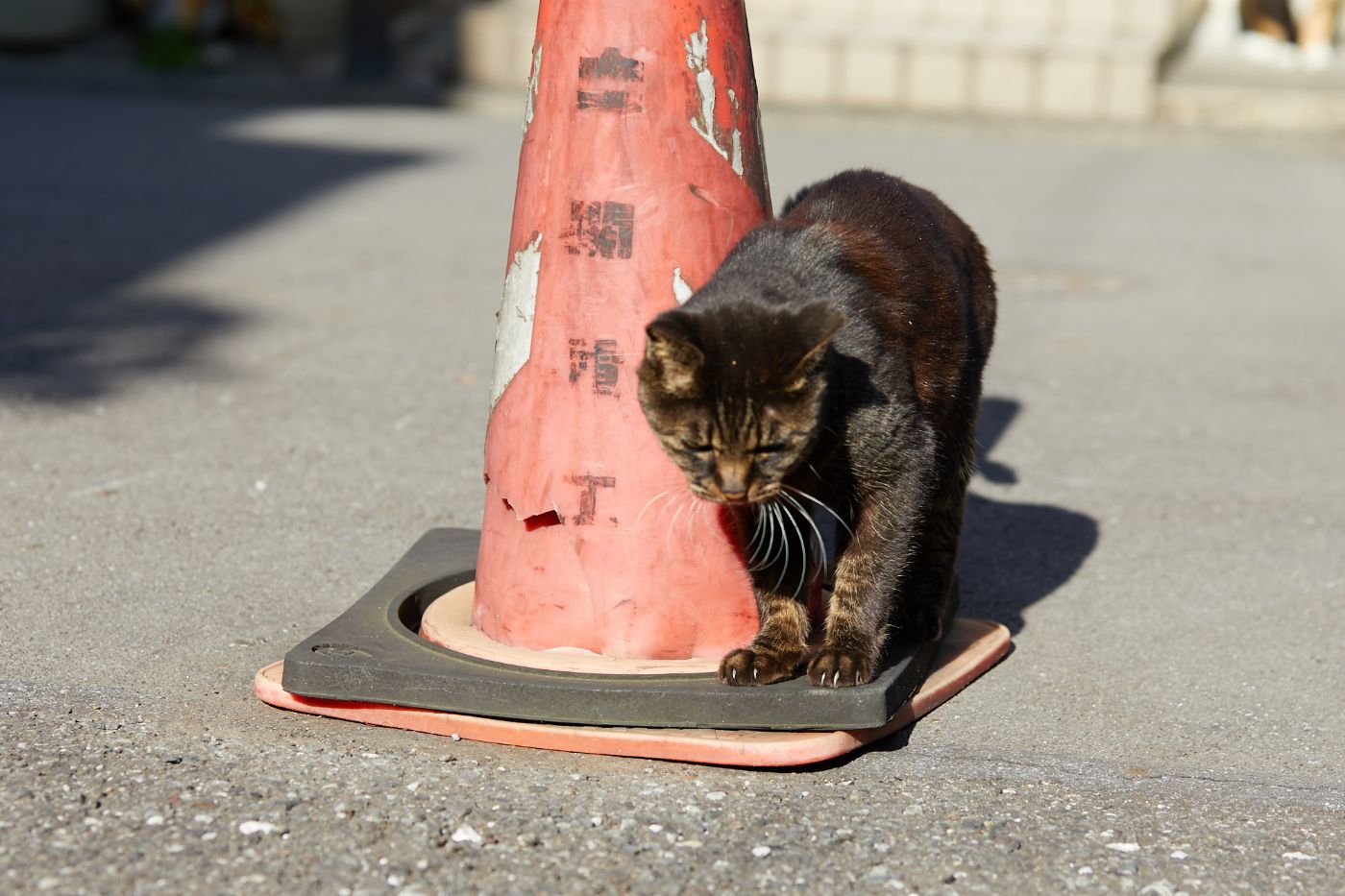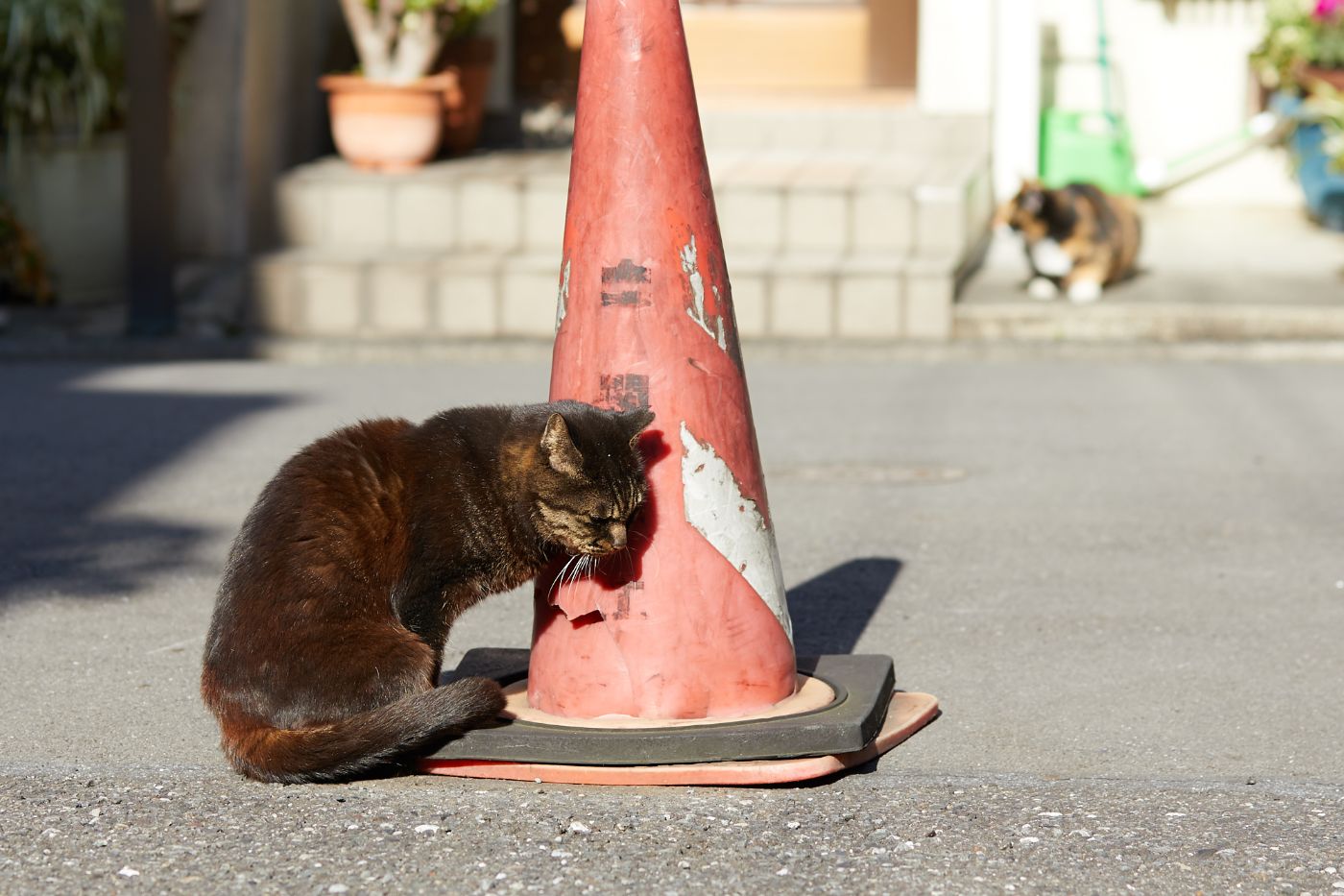 失恋して、うらめしそうに三角コーンを見つめる三毛猫ちゃん。でも、きっとまたすぐに良い出会いがあることでしょう。