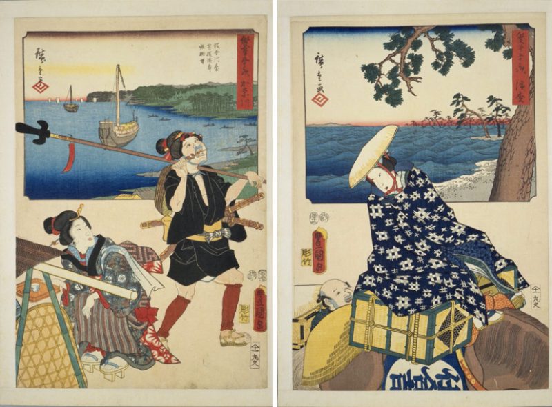(左)広重,豊国「双筆五十三次 加奈川」 (右)広重,豊国「双筆五十三次 浜松」 ともに安政元年 国立国会図書館デジタルコレクションより