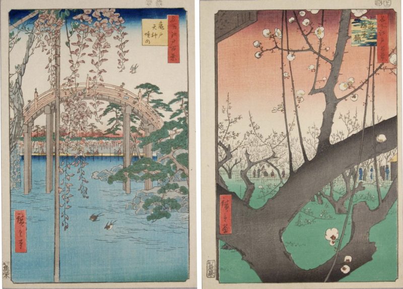 (左)歌川広重「江戸名所百景 亀戸天神境内」 (右)歌川広重「江戸名所百景 亀戸梅屋敷」ともに安政3年から5年ごろ 足立区郷土資料館収蔵資料データベースより