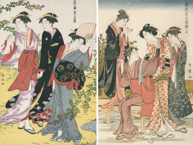 (左)鳥居清長「風俗東之錦・萩寺」19世紀 (右)喜多川歌麿 「風流花之香遊・萩寺」天明時代前期