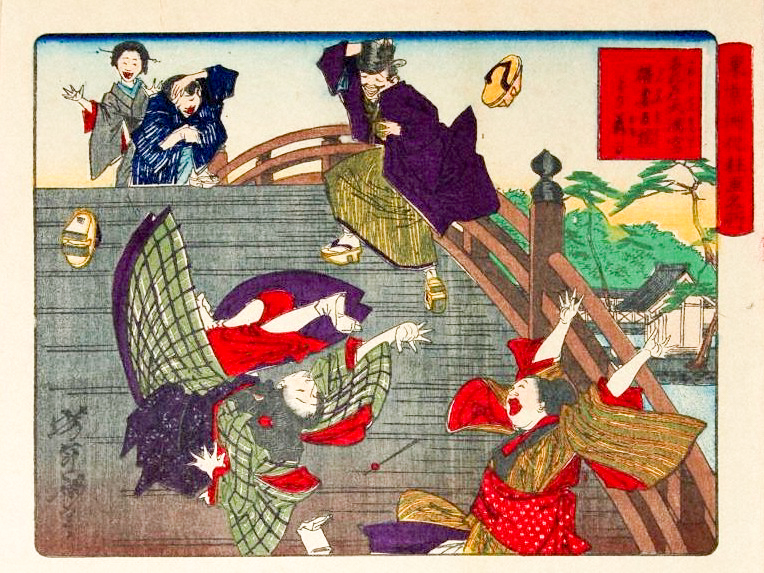 月岡芳年「東京開化狂画名所 亀戸天満宮」 明治14年 足立区郷土資料館収蔵資料データベースより