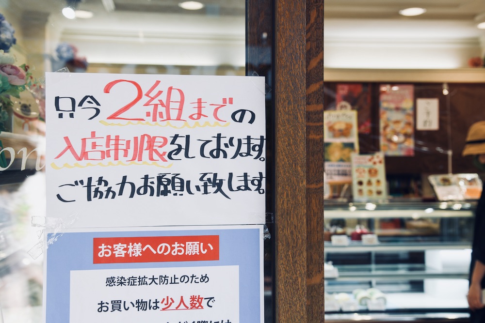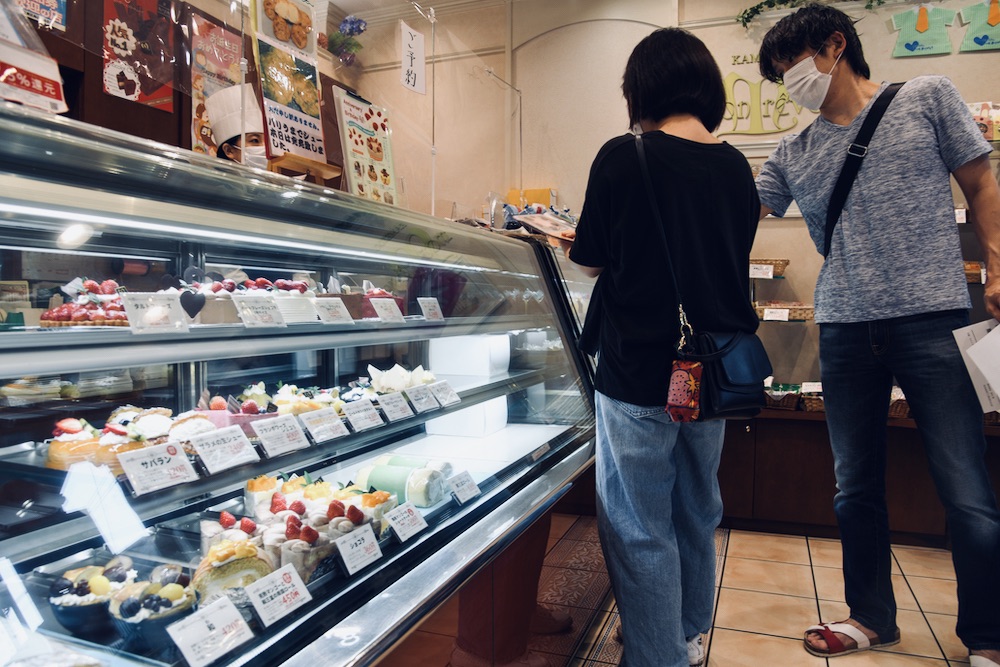店頭には「2組までの入店制限」を示す張り紙。ケーキが並ぶ什器の上には全面に飛沫防止の幕が張られていて対策は万全だ。写真を撮らせてもらいながら店員の方に話を聞くと、緊急事態宣言前の状態に客足は戻ってきているという。この時も若い男女が記念日用のケーキの注文に来ていた。