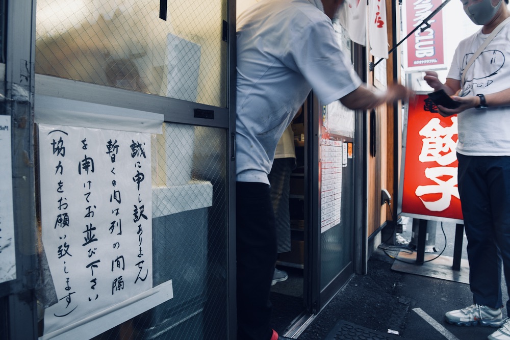 夕暮れ過ぎて賑わいを見せるのは、呑ん兵衛が集まる亀戸横丁界隈だ。ここに集まる店もできるかぎりの対応で安心・安全の確保に取り組んでいる。机の中間に仕切りを設ける立ち飲み屋、店じゅうに幕を張って飛沫の防止に努める居酒屋、ソーシャルディスタンスを考えて店内のレイアウトを工夫するその他の飲食店…、亀戸を代表する「亀戸餃子」でも「列の感覚を開けてお並びください」と行列客に呼びかけていた。