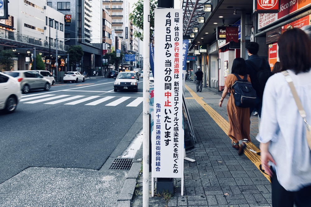 北口駅前にあるファストフード店のカウンターには店員と客とを隔てる透明の幕が張られ、亀戸十三間通商店街の入り口には「当面の間、日曜・休日の歩行者用道路は中止」と書かれた看板が立っている。さらには未だ臨時休業のまま、シャッターが閉まった店もある。本当の「普通」が帰ってくるまでは、まだだいぶ時間がかかりそうである。
