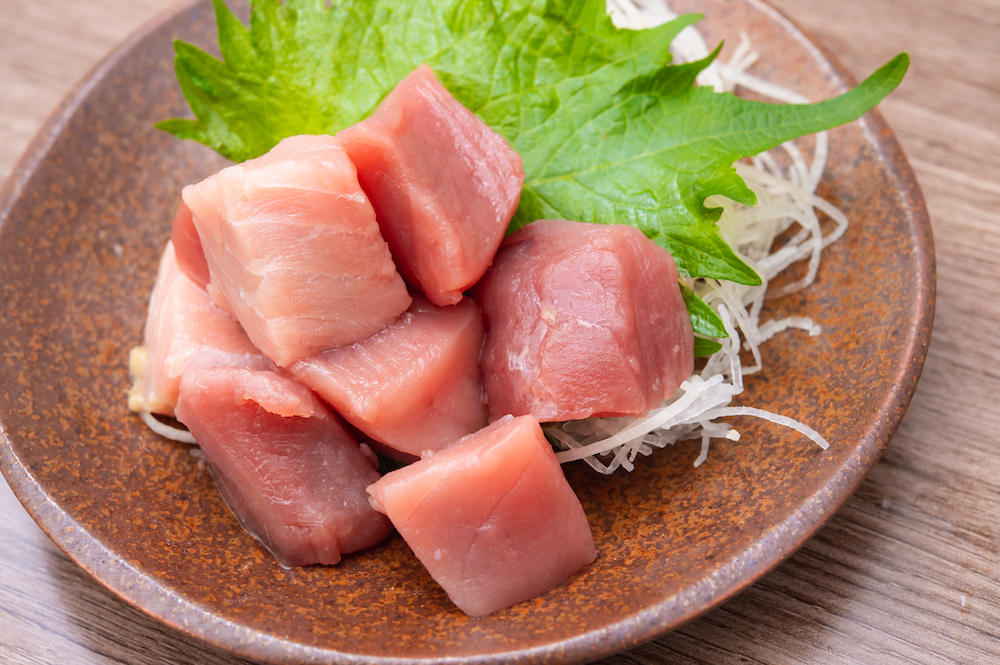 「それから、こちらは『マグロぶつ』。部位を厳選したマグロ。こちら、たった380円なのにスゴい盛りですね〜」