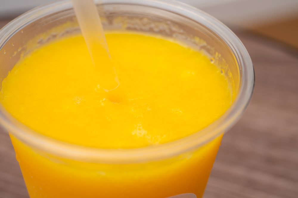 「おすすめポイントは砂糖不使用でこの甘さ。こちるさんのフルーツMIXは砂糖を使用していません。フルーツのみでこの甘さなんです。そのために自然の甘さが体にやさしい。さらに使用するフルーツは日替わり。さて、今飲んでいるフルーツMIXは何が使われているでしょう?」