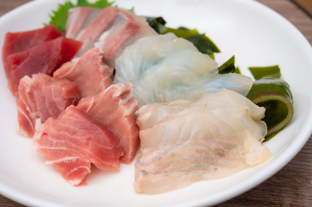 「続いて、こちらはテイクアウト用のお刺身3点盛り。これはお店で食べる時より量がありそうです。今日はマグロ、カンパチ、タイですね」