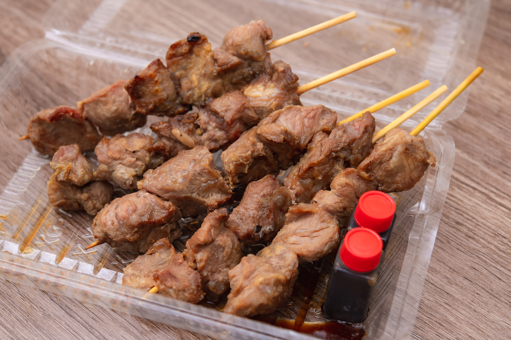 「1軒目は、豊洲市場から毎朝鮮魚を仕入れているしたぢ屋さんのテイクアウトグルメを紹介したいと思います。まずはおまかせ串焼き。5本400円でございます!」