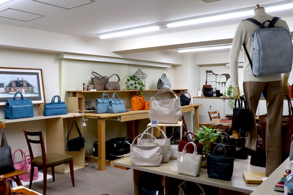 同じく亀戸6丁目には、ピッチーノの革製品が並ぶショールームがある。